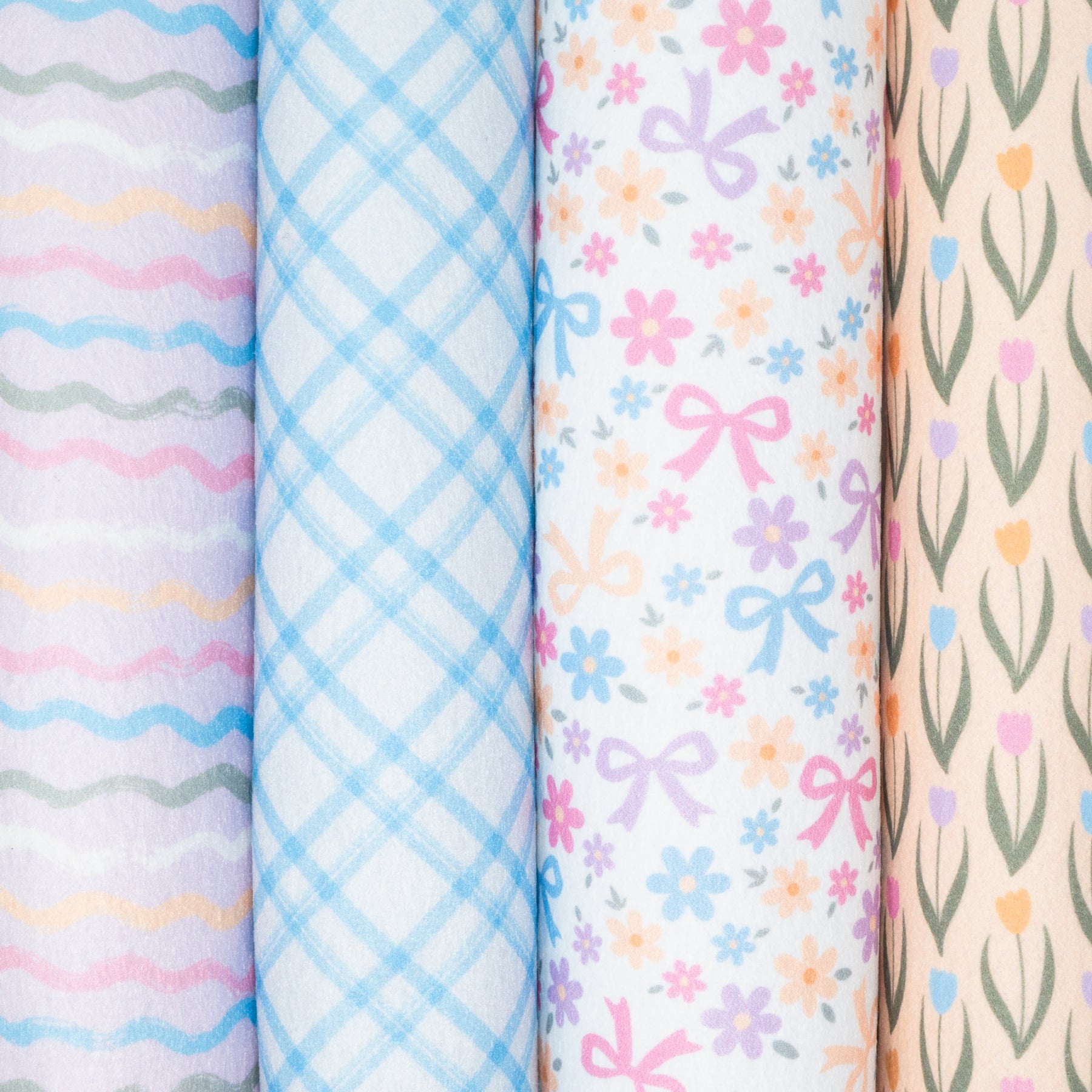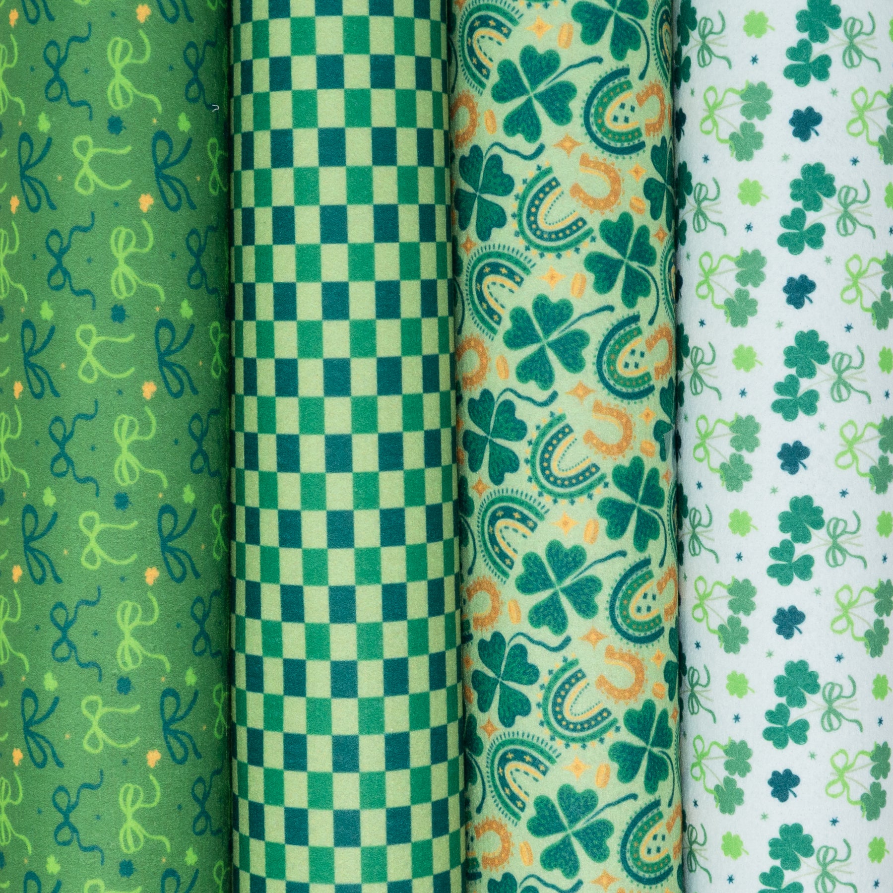 This cheerful printed felt combines classic St. Patrick’s Day charm with a soft, playful feel! This Collection includes one sheet each of: Emerald Bows, Lucky Check, Fields of Gold, and Clovers and Bows.