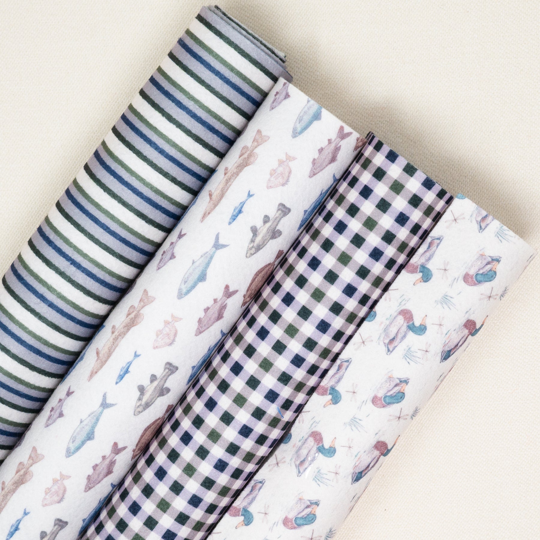 This nostalgic printed felt collection is full of classic Lake Life vibes! This Collection includes one sheet each of: Outdoorsy Stripe, Fisherman's Catch, Outdoorsy Gingham, and Mallard Marsh.